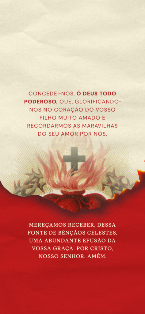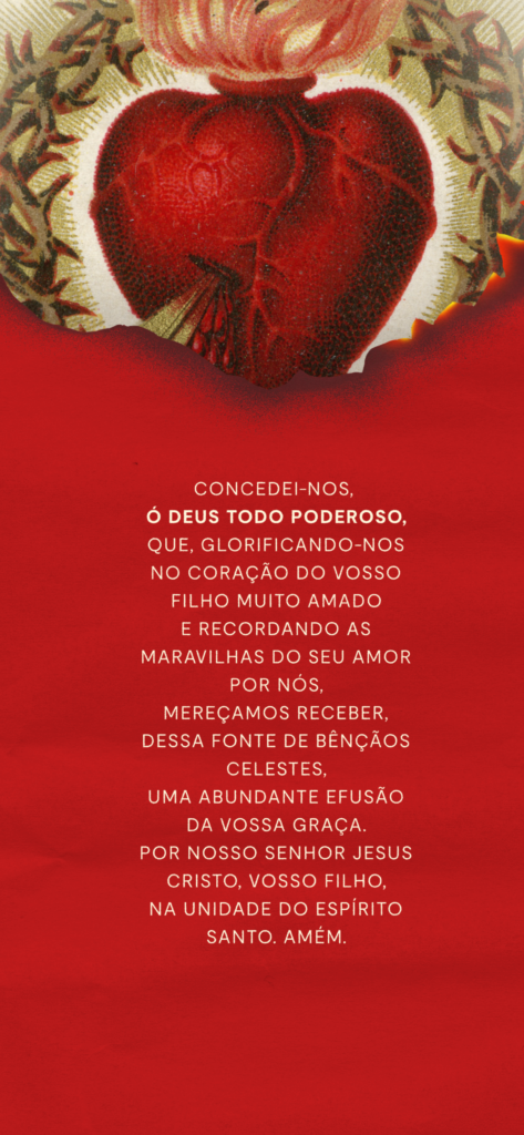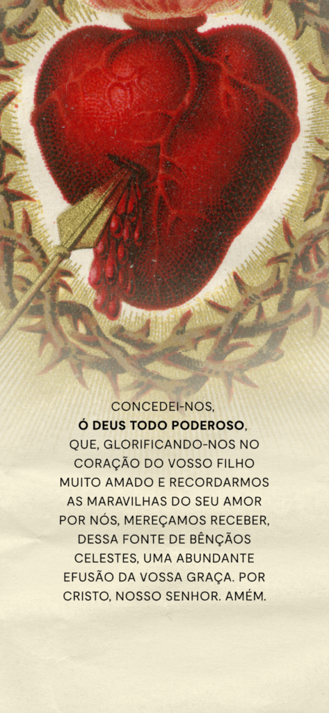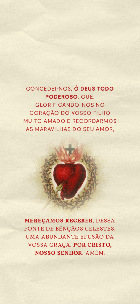 Ó Sagrado Coração de Jesus, para quem é impossível não ter compaixão dos aflitos, tenha piedade de nós, miseráveis pecadores, e conceda-nos a graça que pedimos a você, por meio do Coração Doloroso e Imaculado de Maria, sua terna Mãe e nossa.